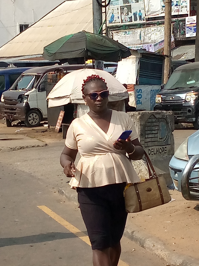 The image depicts an outdoor street scene within a commercial area, identified as being in Aba, Nigeria. In the foreground, a woman with dark skin and a red braided hairstyle walks from left to right, positioned slightly right of the frame's center. She is wearing large, dark-lensed sunglasses with light frames, a light gold-colored V-neck peplum top, and a dark, form-fitting skirt. A gold-toned bracelet is visible on her right wrist. She carries a rectangular brown and beige handbag with dark straps over her left shoulder and holds a blue smartphone in her right hand. Her mouth is slightly open, and she appears to be looking forward. The ground is uneven asphalt with a faded yellow line marked near the bottom left. To the woman's right, a concrete curb delineates a raised area. On this raised area, a grey concrete block structure is visible, marked with "POS" in white lettering and "DELHOPE" faintly inscribed below. The background is densely packed with elements indicative of a commercial street. A large white market umbrella is situated directly behind the woman, with a smaller green and dark green striped umbrella further behind it. Vehicles are present: a light-colored van with a damaged front bumper and hood is parked on the left, and a dark-colored van is parked on the right. A portion of a light blue/silver car is visible on the far right. A tall utility pole, laden with wires and numerous advertisements featuring images of people and text, including "NEW SPLENDOR" and "EVENT PLANNING," stands in the mid-ground. A building with a light-colored, peaked roof is visible in the upper left background. The scene is illuminated by daylight.