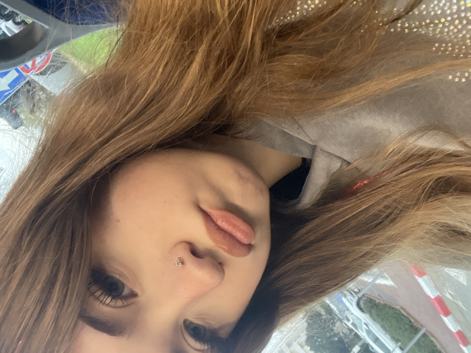 A selfie-style portrait depicts a young female looking directly at the camera, indoors, likely within a vehicle or building, against an out-of-focus exterior street scene. The subject has long, light brown hair with auburn undertones, extending past her shoulders; a single, fine red tinsel-like strand is present on the left side of her hair. Her eyes are light, framed by prominent eyelashes. A small, metallic stud pierces her right nostril. Her full lips are slightly pursed in a pout and appear glossy. She is wearing a light grey hooded sweatshirt, with subtle, reflective embellishments visible on the right shoulder area. Through the window in the background, an urban or suburban street environment is visible. Elements include a partial view of a light-colored vehicle, a red and white striped barrier or curb, green foliage, and a blue and white sign, all out of focus. The ambient lighting is soft and diffused. This scene is situated in the city of Raanana, Israel.