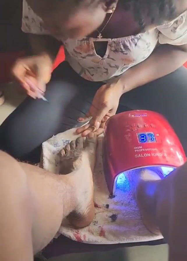 A woman with dark curly hair is sitting on a chair and tending to a man's foot. She is wearing a white floral-patterned blouse and black pants. She is applying a substance to the man's toenail using a small applicator. The man's foot is resting on a white towel that is placed on a purple cushion. A red "SALON KING'S" nail dryer with a digital display of "33" is emitting a blue light and positioned next to the foot. The floor is tiled and the scene is brightly lit.