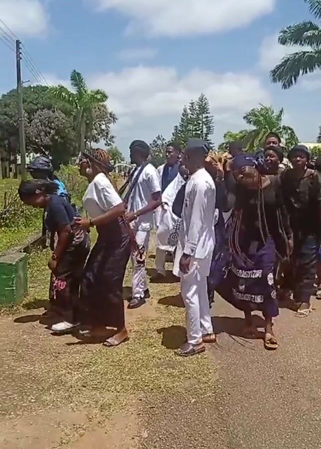 A group of about 15 people are walking along a paved road on a sunny day. Most of them are women, dressed in black or dark blue clothing with patterned wraps around their waists. Some are wearing head coverings. Several men are in white shirts and pants. One man is carrying something on his shoulders, possibly a coffin or a similar rectangular object. The group is spread out along the road, with some people closer together than others. There is green grass and some trees along the side of the road. In the background, there are buildings and a clear blue sky with scattered clouds. The sound of ululation is present.