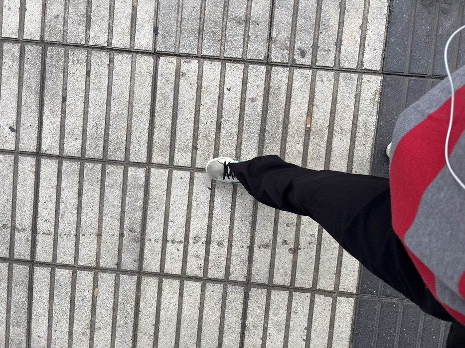 - "An overhead, first-person perspective photograph captures the lower body of an individual walking or standing on a sidewalk in Madrid, Spain" by FM-y5FNm2, licensed under CC BY 4.0