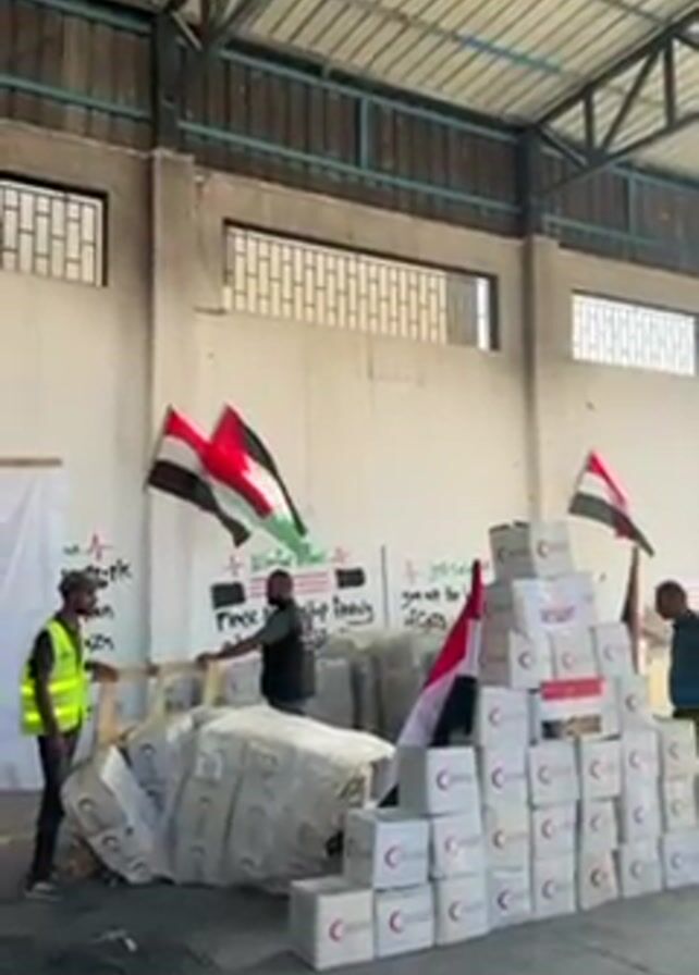 n indoor warehouse-type space with people and supplies. Several flags, possibly of Palestine, are visible. Boxes with a red crescent symbol are stacked in a pyramid shape. A forklift is also present. Some of the people appear to be moving large bundles or boxes. Graffiti and messages can be seen on the walls. The overall impression is a logistics hub for humanitarian aid.