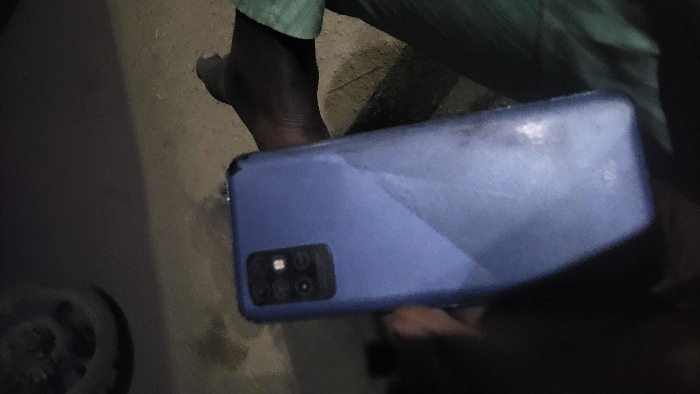 A hand holds a blue smartphone with a visible camera module featuring multiple lenses. The phone's surface appears scratched or smudged. The image is captured in dim lighting, which casts shadows on the phone. A bare foot is partially visible near the phone. The person is wearing light-green pants. The background includes a cement-like surface, along with some parts of what may be a wheel in the far side.