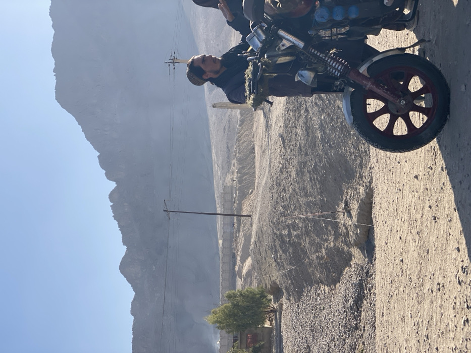 The image depicts an arid, mountainous landscape within the city of Deh Sabzi, Afghanistan, under clear skies. In the right foreground, a modified motorcycle, featuring a red multi-spoke front wheel, silver fender, and various attached items including cylindrical objects and organic material on the handlebars, is partially visible. Standing next to the motorcycle, facing right, is an adult male with a beard and mustache, wearing a dark garment and a light-colored skullcap. His left hand is positioned near the motorcycle's handlebars. Part of a second individual's dark clothing or arm is visible to the right, suggesting proximity or interaction with the first man or the motorcycle. The immediate ground is composed of light-colored dirt and gravel, forming an uneven path. A narrow gully with loose stone and dirt runs across the midground, featuring two slender poles with attached lines. Further back, a dirt embankment rises. On the left midground, two small green trees stand near a low, possibly structural, element. Beyond this, a horizontal line of light-colored structures, resembling concrete barriers or sandbags, spans the scene. In the deeper midground, numerous uniform, light-colored structures, possibly tents or temporary shelters, are arranged in rows. Overhead utility lines are supported by several wooden poles traversing the landscape. The background features prominent, rugged, dark mountains partially obscured by atmospheric haze. Shadows indicate a high sun angle.
