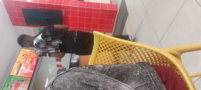 This image depicts an indoor scene within a fast-food restaurant in Nakuru, Kenya, consistent with the branding and interior design of a KFC outlet. In the midground, a male individual stands with his back to the camera, facing a service counter or menu display. He has short, dark hair and is dressed in a black t-shirt, black trousers with a visible dark belt, and a black and white plaid shirt draped over his left shoulder. Above him are two illuminated digital menu boards; the left board prominently displays "MUNCHIN" alongside images of fried chicken. To the right of the standing individual, a wall section is covered in small, square red ceramic tiles. A rectangular black digital screen, which appears to be off or displaying an error, is mounted on this red-tiled wall. In the immediate foreground on the left, the back and left shoulder of a second individual are partially visible, seated with their back to the camera. They are wearing a grey distressed denim jacket over a reddish garment. A yellow plastic chair with a mesh-patterned backrest is positioned in front of this seated person. The floor is made of light-colored tiles with dark grout lines, and a small dark rectangular floor mat is visible near the red tiled wall. The environment is brightly lit, typical of a commercial eatery. The standing individual appears to be observing the menu, possibly waiting to place an order.