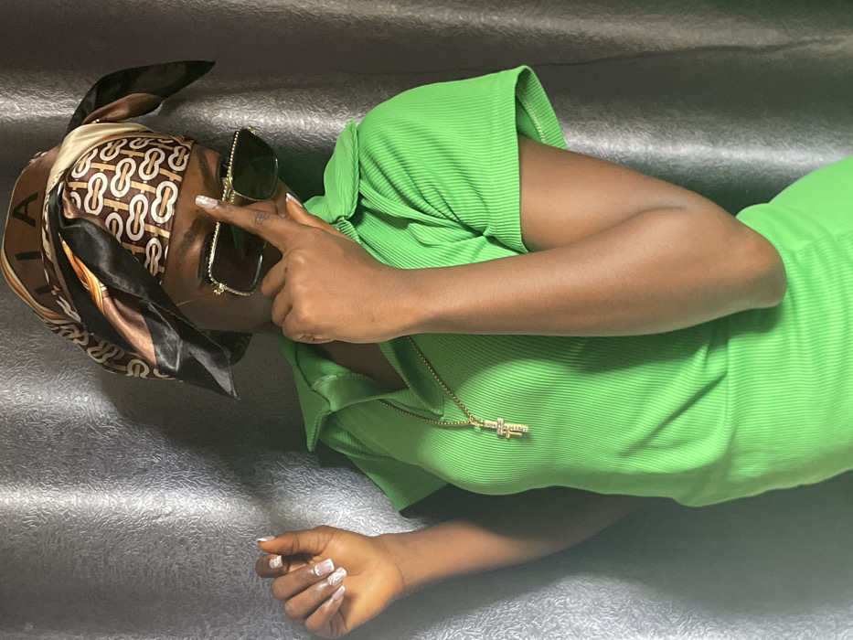 A woman in a vibrant green ribbed dress poses while lying down. She wears a patterned headscarf in shades of brown and black, and sunglasses with gold frames. Her hand is raised to her face, and a gold necklace with a cross pendant adorns her neck. Her nails appear to have a light, possibly French-tipped, manicure. The background features a textured gray surface.