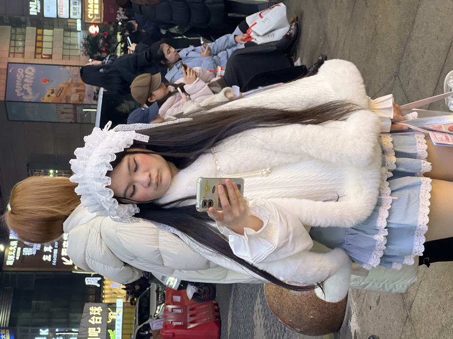 The image captures a crowded urban street scene at night in Liangjiang, China. The primary subject, a young East Asian female, occupies the foreground, facing slightly left and looking down at a silver-colored smartphone held in her right hand. She wears a white lace ruffled headpiece, a white faux fur cape over a white long-sleeved shirt with ruffled cuffs, and a light blue tiered skirt with white lace and pink trim. Her long dark hair is parted centrally. Pink blush is visible on her cheeks. A string of white beads is around her neck, and she holds a small, light-colored bag in her left hand. Immediately behind her, a person in a cream puffer jacket with light brown hair is partially visible. To the left, a large, polished reddish-brown spherical street barrier is on the ground, with red plastic barriers and a white scooter further back. To the right of the primary subject, several individuals are visible; two East Asian females are seated, both focused on their smartphones. One wears a brown cap and a pink puffer jacket, while the other wears a light blue puffer jacket and dark pants. Shopping bags are visible near their feet. A dark vehicle is partially obscured in the mid-ground. The background features illuminated multi-story buildings with numerous signs, predominantly in Chinese characters, including a prominent "MINISO LAND" sign. The ground is paved, indicating a commercial pedestrian area.