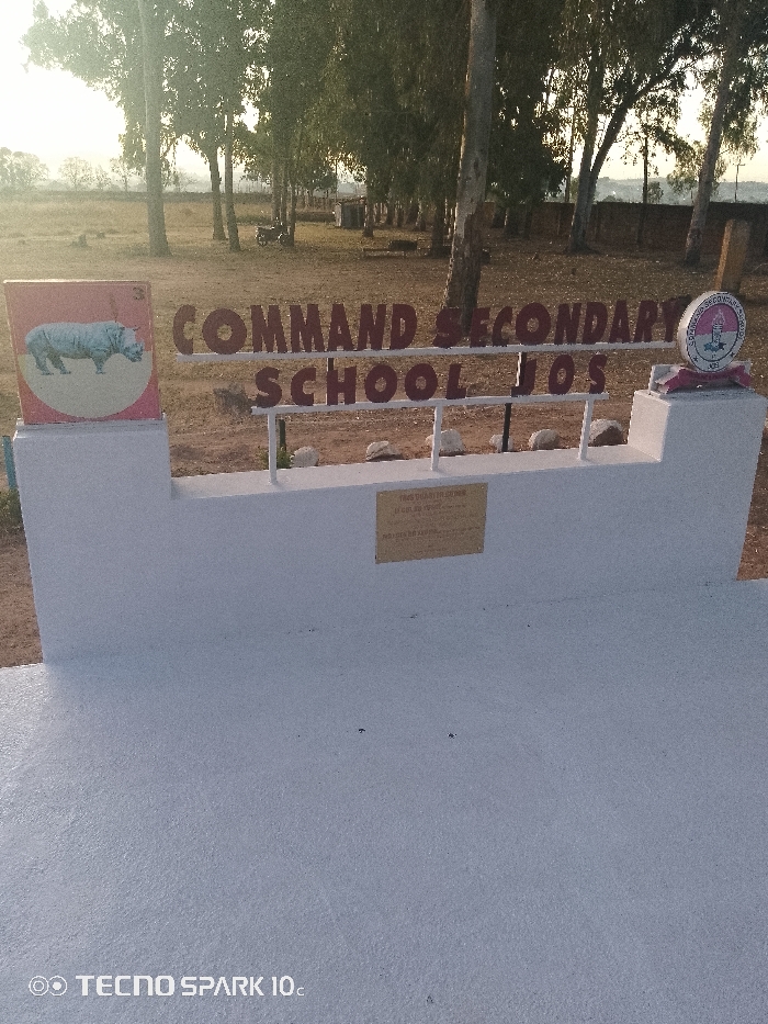 The photo captures the entrance to Command Secondary School Jos, marked by a white, low-walled structure