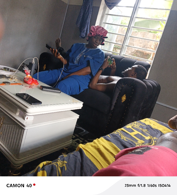 In a brightly lit room, a woman wearing a pink hair bonnet and blue outfit sits on a black sofa, holding a phone. A shirtless man reclines on the same sofa, looking at his own phone. A tiered white coffee table sits in front of them, cluttered with items including phones and snacks. Part of a person wrapped in a yellow and gray blanket lies on the floor. A window is visible in the background. A blue garment hangs on a wall.