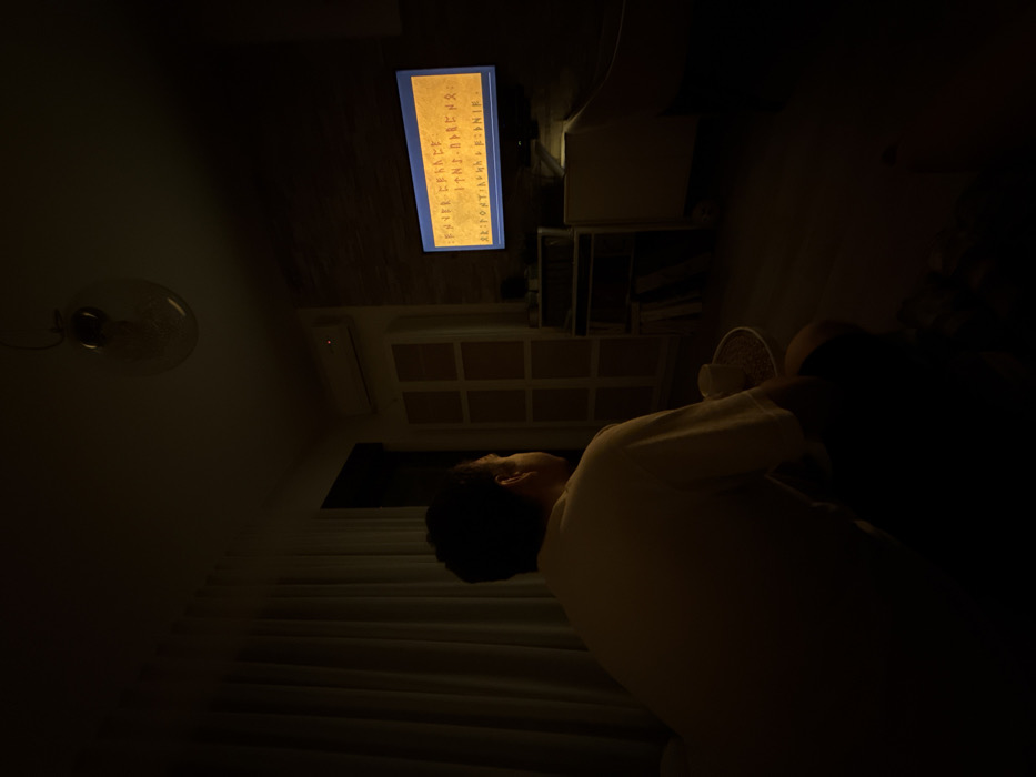 - "A person lies in bed in a dimly lit room, facing a wall-mounted television displaying ancient text" by FM-7mF7g2, licensed under CC BY 4.0