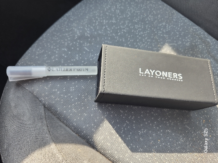 The image depicts a black rectangular container holding a transparent, pen-shaped atomizer on a grey, textured fabric surface, likely a car seat, within Novo Delchevo, Bulgaria. The container, positioned vertically with its longer side parallel to the camera's frame, features the silver text "LAYONERS" and "LAY ON YOUR HORSE" printed on its visible face. The atomizer, inserted into the top of the container, is clear with a translucent white cap and displays the vertical text "L'ATELIER PARFUM." The grey fabric surface exhibits a patterned weave with small white dots and visible stitching. Strong directional lighting from the left casts a prominent shadow of the container onto the fabric. A "Galaxy S25" watermark is present in the lower-left corner. No individuals or active interactions are visible in the scene.