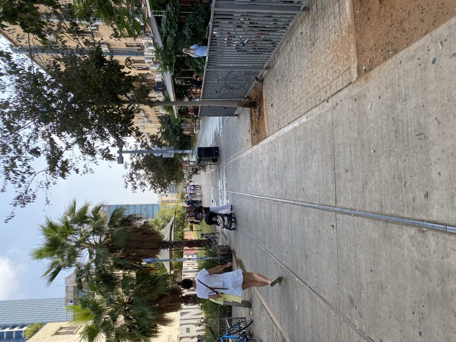 A sunny street scene is captured from a slightly elevated angle. A woman in a white dress and carrying a yellow bag walks along the sidewalk lined with palm trees. Further down the path, a group of people can be seen, including someone pushing a stroller. Buildings and lush greenery flank the street, and a metal railing runs alongside the sidewalk. A metal line is laid in the middle of the sidewalk.
