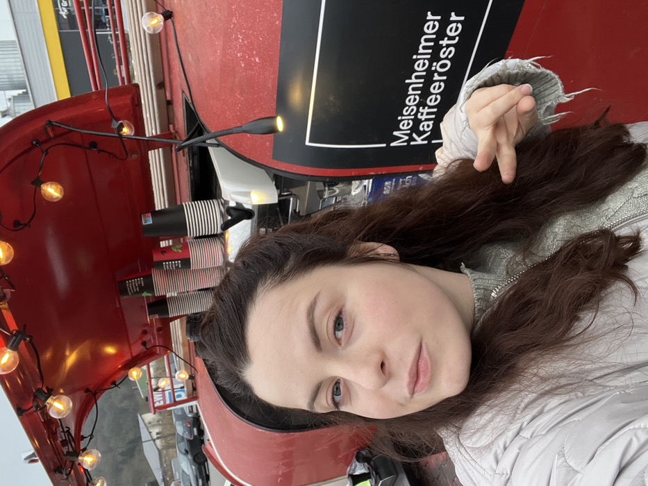 An outdoor, eye-level photograph depicts a young adult female posing for a selfie in front of a red mobile coffee truck. The scene is set in what appears to be a commercial or industrial area of Meisenheim, Germany. The female subject, positioned centrally to the left, has long, dark brown hair and a neutral expression, gazing directly at the camera. She wears a light-colored, possibly pale gray or beige, quilted jacket over a ribbed knit sweater. Her left hand is raised, performing a 'V' sign with her index and middle fingers, exposing a frayed cuff of her sweater. Behind the woman and occupying the right and upper portions of the frame is a red mobile coffee truck. Its upper hatch is open, revealing stacks of disposable coffee cups in various designs (black striped, red with leaf motif, plain white) and elements of a coffee preparation station. A string of warm-toned spherical lights is draped along the truck's open roofline. A small, black, flexible-neck LED light is also affixed to the truck's exterior. A prominent black sign panel on the side of the truck displays "Meisenheimer Kaffeeröster" in white text. In the background, behind the truck, a parking lot with several dark-colored vehicles is visible. Further back, a building with a partially visible "EWE" sign suggests a commercial establishment. Beyond this, industrial-type structures, possibly silos or factory buildings with gray and yellow accents, are present. Distant hills with sparse vegetation are visible under an overcast sky. The overall environment suggests a commercial or industrial park on the periphery of Meisenheim.