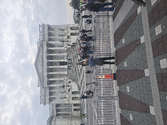 The United States Capitol building stands prominently, its columns and facade visible beneath a slightly overcast sky. Groups of people are gathered on the steps and surrounding plaza, some holding flags. Barriers and a traffic cone are placed on the ground near the paved area. The photo is rotated.