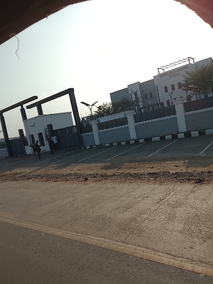 A school building marked "RYBRID PREPARATORY SCHOOL" stands behind a white and grey wall topped with barbed wire. The scene includes a gated entrance with two dark, vertical frame structures. Solar-powered street lights illuminate the area. The foreground shows a paved lot with painted parking spaces. A portion of a road with a painted stripe runs across the bottom, and a dark obstruction is visible in the top left corner of the image.
