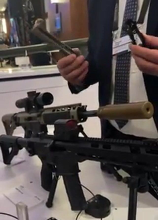 table with several guns on display. A man in a suit and tie is standing next to the table. He is holding two small pieces of metal in his hands. The guns on the table include a rifle with a scope, a rifle with a red dot sight, and a handgun. The rifles both have suppressors attached to their barrels. The table is white and there are small signs in front of each gun. The background is blurry and shows other people and booths, possibly at a trade show or conference. The man is speaking and gesturing with the metal pieces, likely describing their function or how they connect.