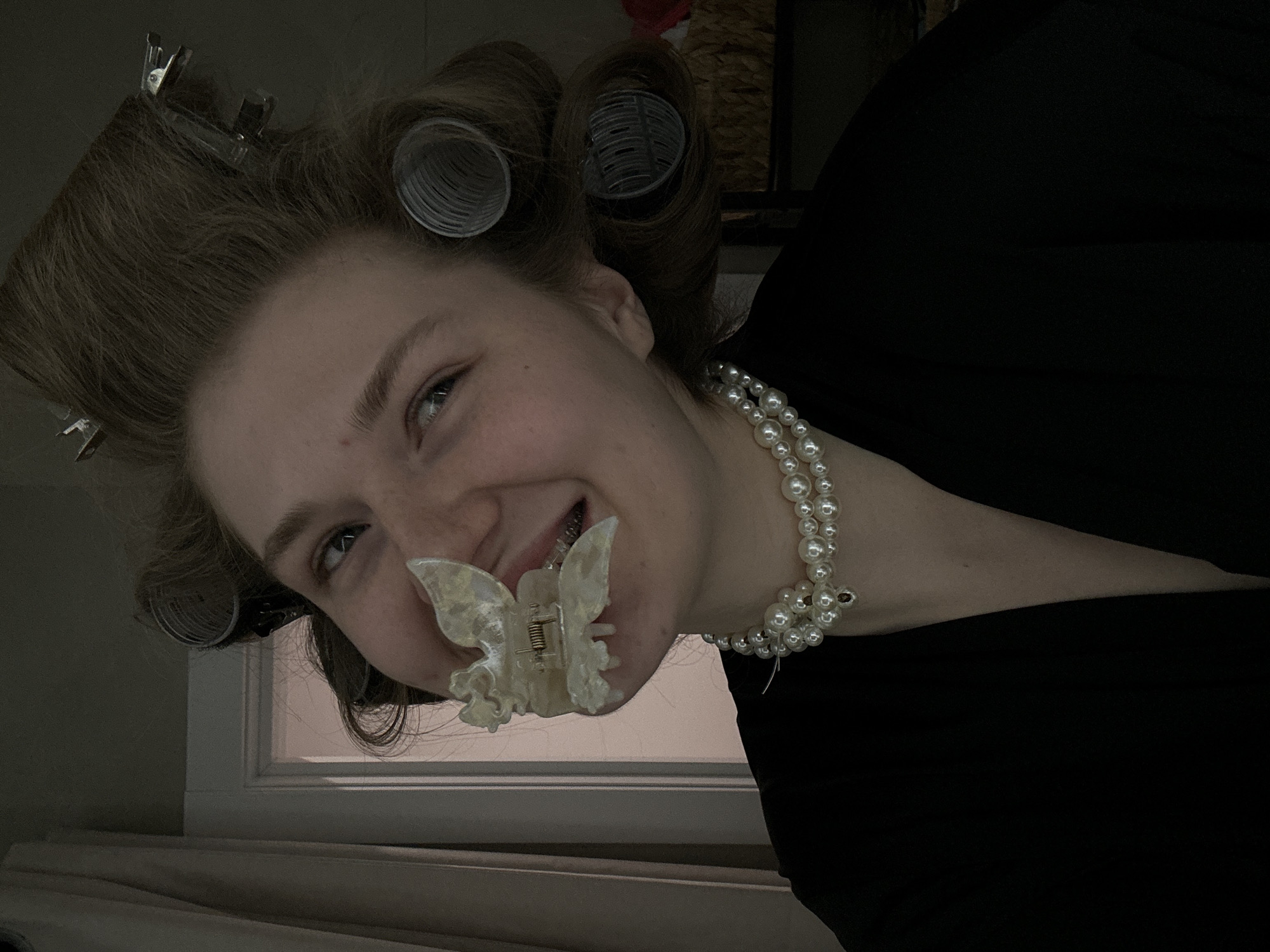 A young Caucasian woman is depicted in a low-light indoor environment. She is wearing hair rollers and a pearl necklace. A butterfly-shaped hair clip is attached to her upper lip. The background includes a window and a dimly lit wall. The specific location in Kazan, Russia, is not identifiable from the image.