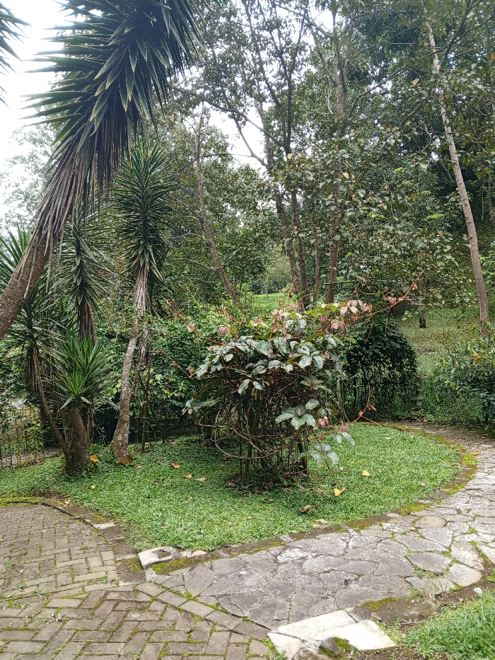A lush garden scene exhibits a blend of brick and stone pathways winding amidst verdant grass. Diverse trees and shrubs fill the space, with palm-like plants near the pathway's edge. A substantial bush, partly obstructing the path, features large leaves and hints of pink. The foliage creates a serene, natural ambiance with a clear focus on green textures and organic forms.