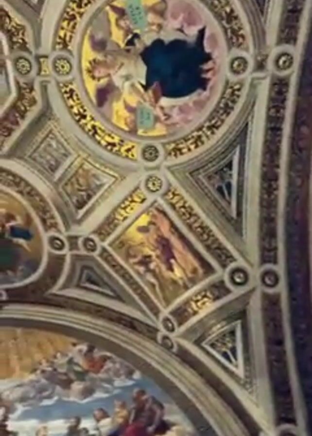 The camera looks up at an ornately decorated ceiling, moving around and showcasing the beautiful details. The ceiling features an intricate design with gilded trim, and paintings in circular and hexagonal shapes, some containing depictions of religious figures, angels, and scenes of people. The lighting is soft, illuminating the ceiling's artistry and color.