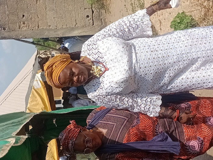 Two women pose in an outdoor setting. One wears a white lace dress, gold headwrap, and elaborate gold necklace. She holds a white object in her hand. The other woman, lying down, wears a patterned orange and brown dress with a matching headwrap and glasses. A blue garment lies nearby. Other people and structures are visible in the background.