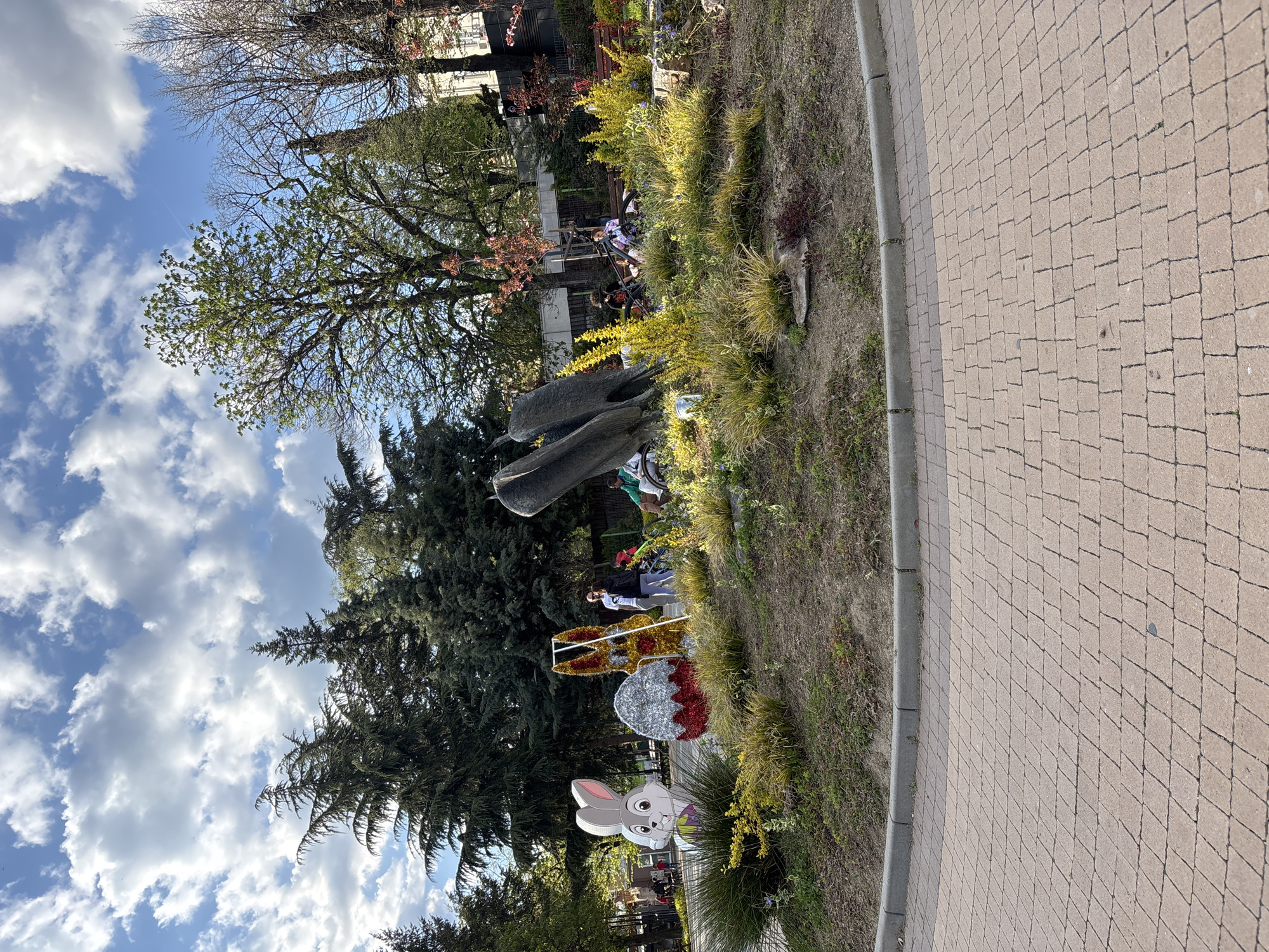 section of a park in Kazanlak, Bulgaria. There is a sidewalk made of interlocking pavers that runs along the right side of the frame. The park area includes trees, grass, and decorative elements. A large, dark metal sculpture of birds is visible. Further along the park, there are Easter-themed decorations including a cut-out of a rabbit and a stylized egg. Several people are visible in the background near the sculpture. The sky is blue with scattered white clouds.