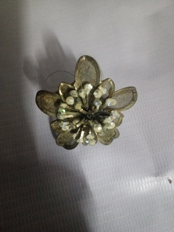A vintage-looking flower brooch lies on a textured white surface. The flower features five net-like petals in an antique gold hue. The center is densely packed with iridescent beads, creating a shimmering effect. A faint shadow is cast to the side, and a strand of hair rests near the flower. The surface has subtle folds and a small dark spot in the lower right.