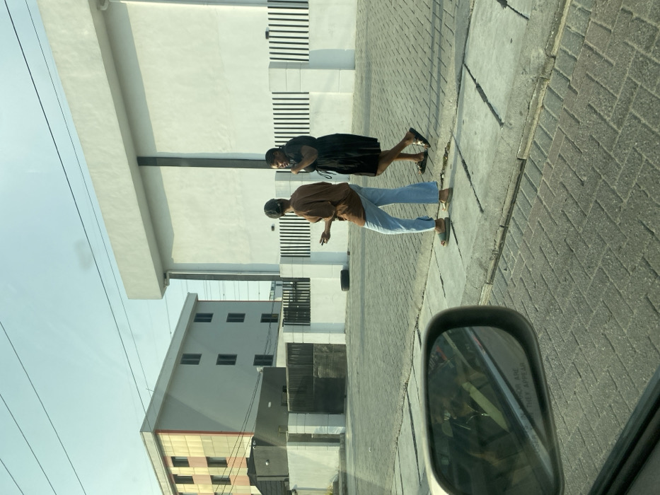 The scene depicts a daytime street view in Ilado, Nigeria, captured from within a vehicle, with its side mirror visible in the lower-left foreground. Two individuals are walking on a grey concrete sidewalk adjacent to a grey brick-paved street. The individual on the left, identified as female, wears a brown t-shirt, light blue wide-leg trousers, and green slides, with a dark cap worn backward. Her right arm is slightly extended, hand open, suggesting a gesture during conversation. The individual on the right, also female, wears a black short-sleeved dress and dark open-toed sandals with light embellishments, carrying a dark bag on her left shoulder. Her right hand is raised towards her face. Both individuals appear to be conversing while moving from left to right across the frame. In the background, a large, modern white building with a flat roofline and vertical dark accents stands behind a white perimeter wall topped with vertical black railings. To the left of this, further back, is a multi-story building with a light-colored facade featuring checkered light orange/tan sections and multiple dark rectangular windows. A dark gate or fence is visible below this building. A discarded black tire lies on the ground near the white wall. Overhead power lines are visible against a clear, light blue sky.