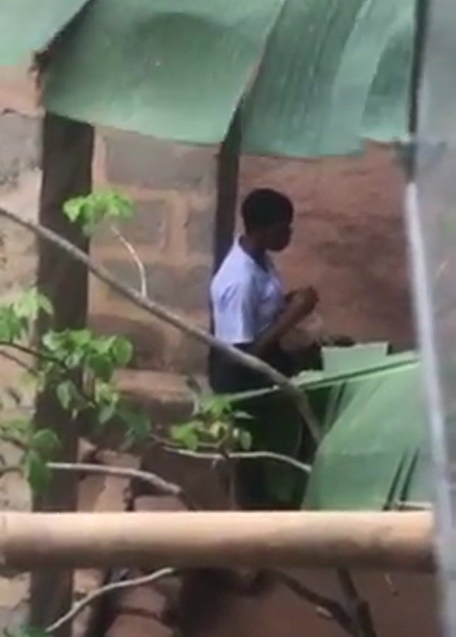 person in what appears to be a light-colored short-sleeved shirt and dark pants standing outside a brick building, possibly a school, and working on something under a makeshift shelter of large green leaves resembling banana leaves. The person is obscured by branches and the leaves of the shelter, making it difficult to discern the exact nature of their activity. The background consists of a rustic brick wall and what appears to be sandy ground. A wooden structure partially frames the foreground, suggesting the video was taken from an elevated position or through a window.