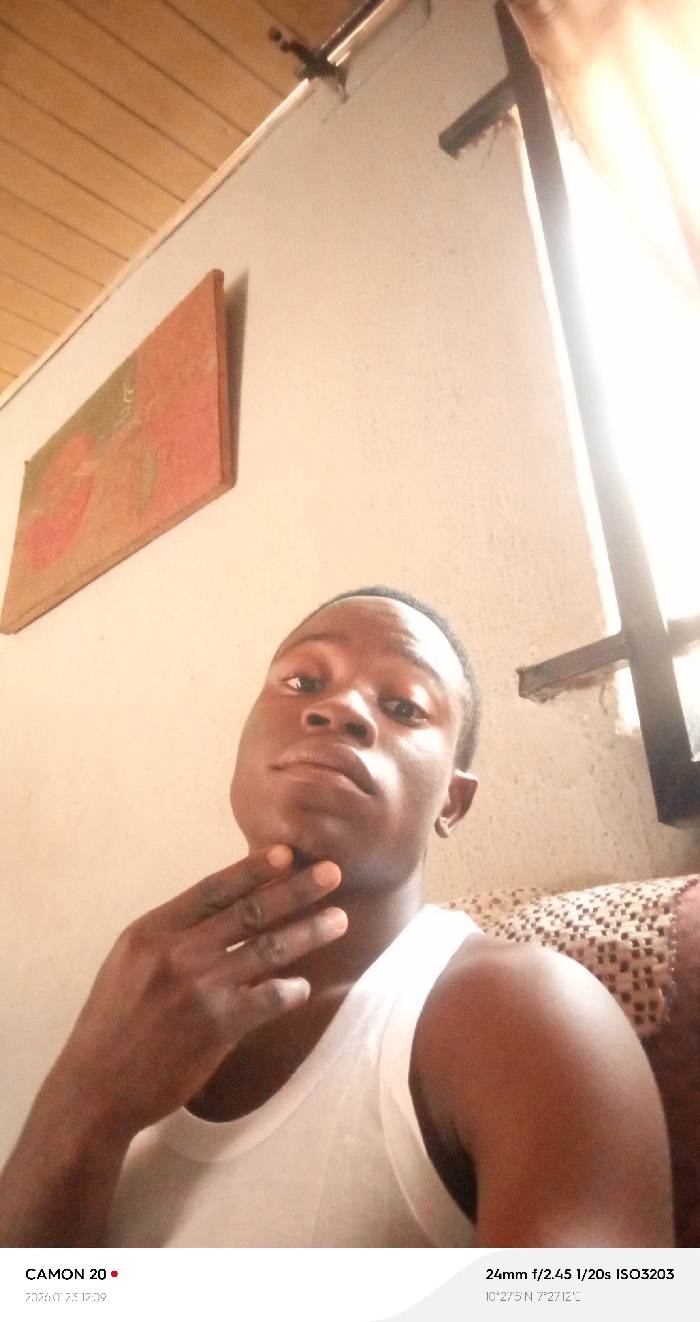The image depicts a young adult male indoors in Sabon Tasha, Nigeria, at coordinates 10°27'5"N 7°27'12"E