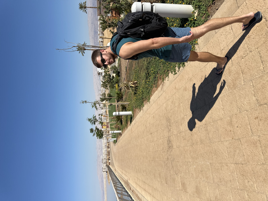 A single adult male is captured walking along a paved promenade under a clear blue sky in the Tamar Regional Council, Israel