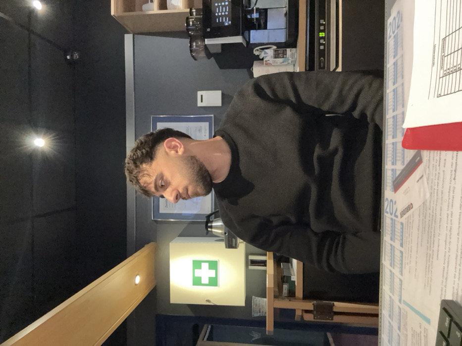 The image depicts an indoor scene within a commercial or administrative establishment located in Remscheid, Germany. An adult male, appearing to be in his 20s or 30s, with dark, curly hair and a beard, is seated in the mid-ground, facing his left, away from the camera. He is wearing a dark, long-sleeved crew-neck sweater. The foreground shows a desk surface covered with several documents, a partially visible black computer keyboard on the far left, and a red binder or folder on the right. A white card with "20%" and the partial text "CARDING" is visible on the documents. The background, from left to right, features a light-colored wooden counter segment holding a clear plastic cup and a silver thermal carafe. A wall-mounted white first aid cabinet with a prominent green cross symbol is illuminated on the dark grey wall. Adjacent to this, a framed certificate, containing the German word "Zertifikat," hangs on the wall. Further right, a multi-compartment automatic coffee machine with a digital display sits on a dark counter, accompanied by various bottles and containers. Below the coffee machine, a dark cabinet unit houses a metallic appliance with illuminated green indicator lights. Overhead, the ceiling is dark, fitted with recessed spotlights, two of which are actively emitting light. A light-colored wooden beam with integrated lighting runs along the left side of the ceiling, and wooden open shelving units are visible above the coffee machine.