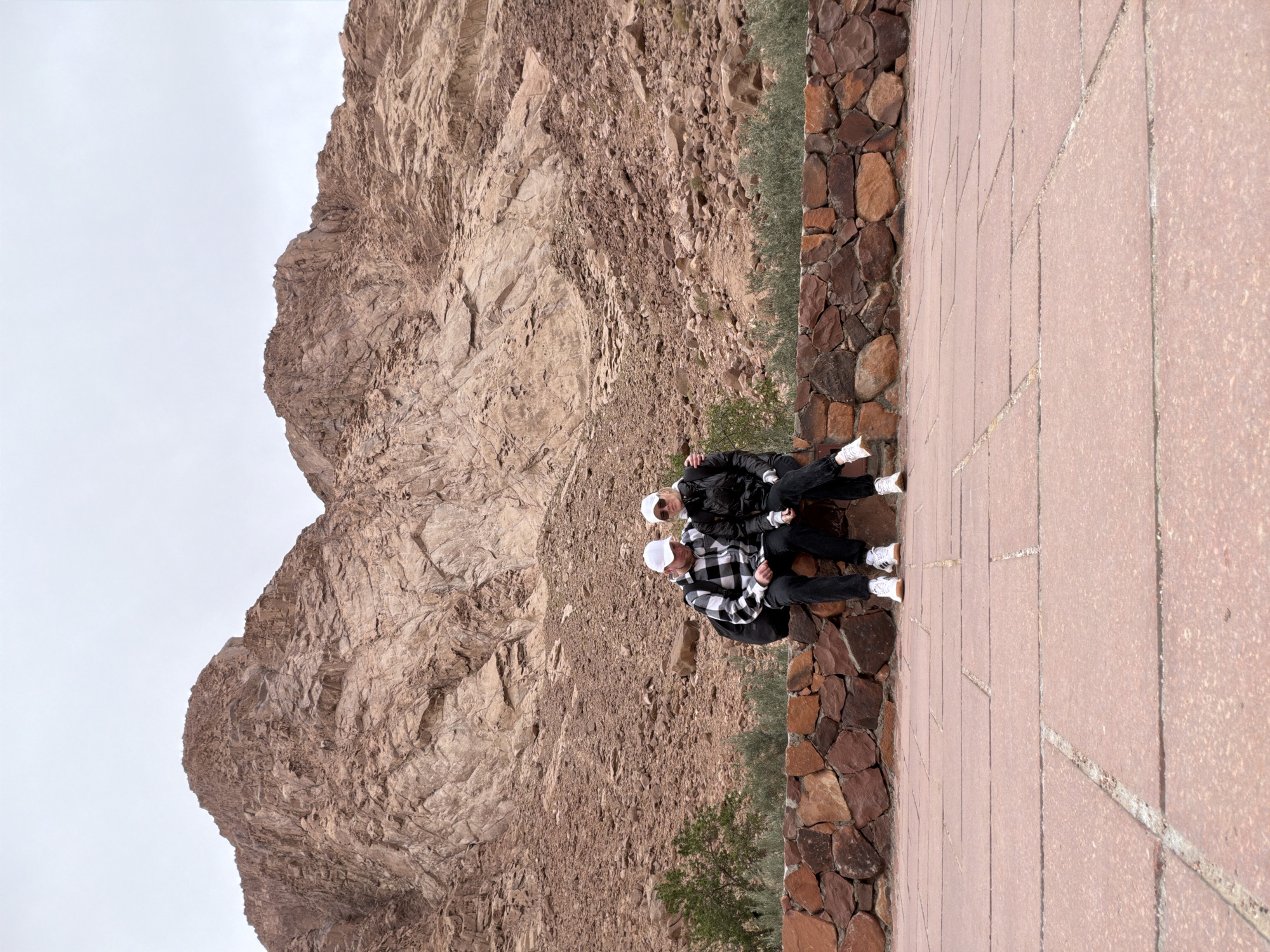 Two individuals wearing white caps and dark clothing are seated on a wall, with a large rocky mountain visible in the background. The setting appears to be outdoors, possibly in a mountainous region, with a stone or brick wall separating a paved area from the natural terrain. The location is likely Saint Catherine, Egypt.