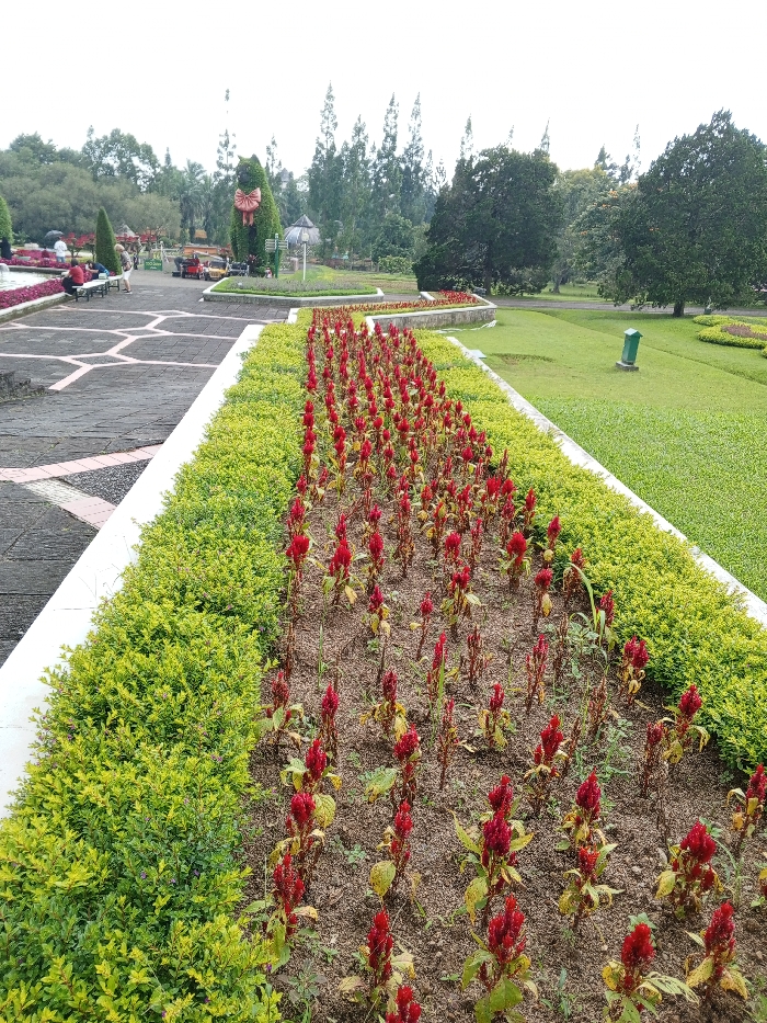 A symmetrical garden path displays a row of red celosia flowers set against a backdrop of lush green shrubbery. The path is bordered by a white retaining wall. A gray stone pathway with geometric patterns is on the left. In the distance, there's a topiary animal sculpture, a small hut, and various trees and plants that form a vibrant green landscape. The weather appears overcast.