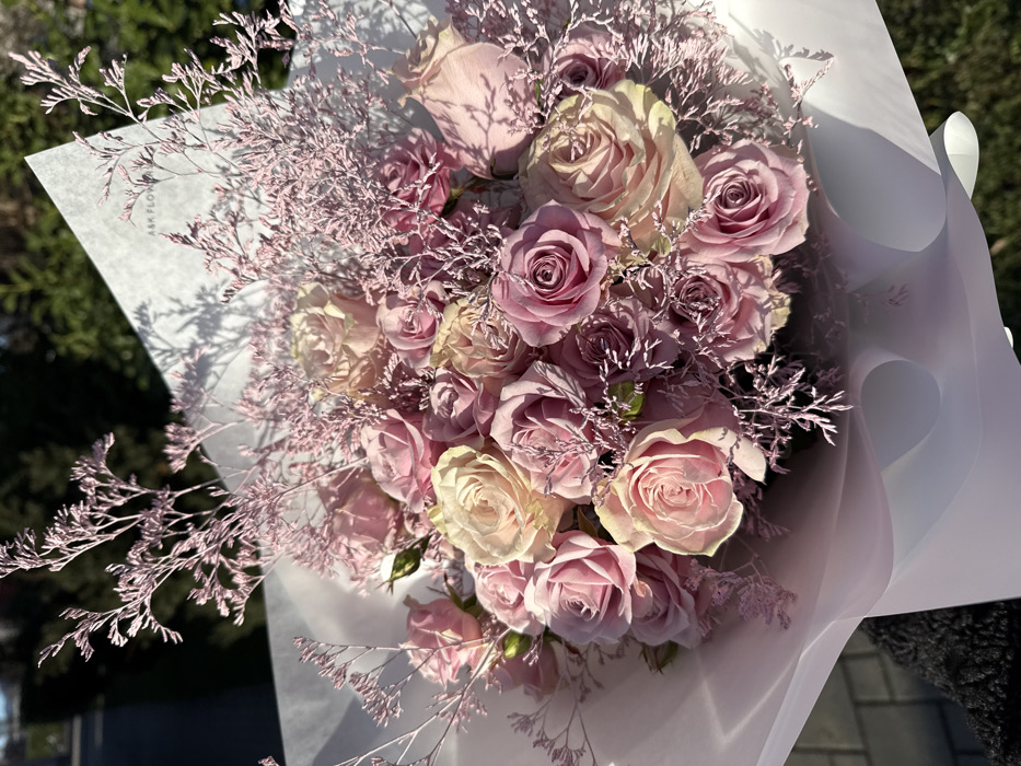 A bouquet of pink and cream-colored roses, interspersed with delicate, light purple filler flowers resembling dried branches. The arrangement is wrapped in layers of white paper and translucent fabric, creating a soft, elegant presentation. Sunlight casts shadows across the bouquet, highlighting the textures and variations in color. The background is blurred, suggesting an outdoor setting.