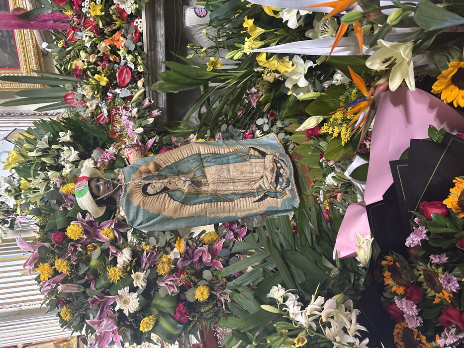 A statue of the Virgin of Guadalupe lies amidst a profusion of vibrant flowers