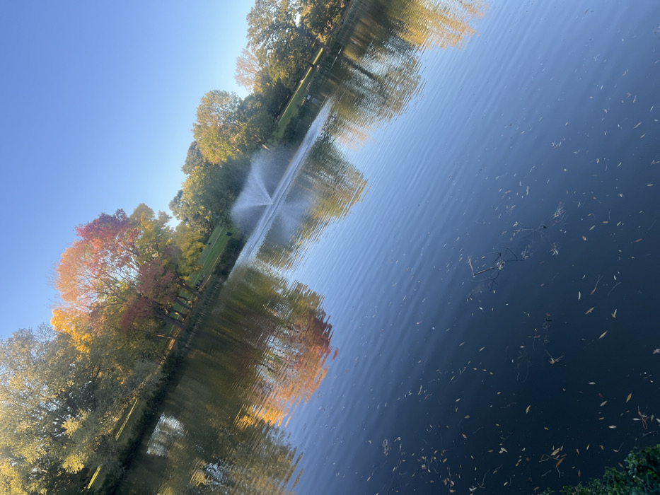 The image displays a tilted outdoor scene at the Upper Castle Park Pond in Colchester, United Kingdom, under a clear sky. The majority of the frame is occupied by the placid pond water, reflecting the surrounding trees and the bright blue sky. Numerous small, elongated leaves and other detritus float on the water's surface, particularly in the foreground. In the mid-ground, a water fountain actively sprays a symmetrical, cone-shaped plume of water upwards from the pond's surface. The far bank of the pond is lined with deciduous trees, several of which exhibit distinct autumn foliage in shades of yellow, orange, and red, intermingled with green trees. These colorful trees are prominently reflected in the pond's surface on the left side of the image. The bank itself appears as a grassy slope extending from the water's edge to the tree line. In the distance, on the grassy bank or at the water's edge, approximately 3-5 dark, small avian figures, consistent with ducks or geese, are visible. The upper right quadrant of the image shows an expanse of clear, cloudless blue sky. The entire scene is captured with a significant clockwise tilt.