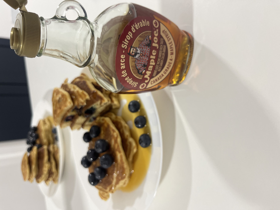 - "The image displays an indoor scene featuring three servings of pancakes with blueberries and a bottle of maple syrup, positioned on a white, reflective surface" by FM-GjcNv1, licensed under CC BY 4.0