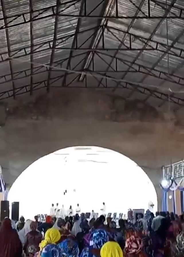 The camera looks up into the metal raftered ceiling of a large building and then slowly moves down and to the right, showing the backs of many people seated in rows of blue plastic chairs. The people are wearing colorful patterned clothing and head coverings. The setting appears to be a church. In the distance, several figures are standing in front of a window. The audio suggests the people are singing.