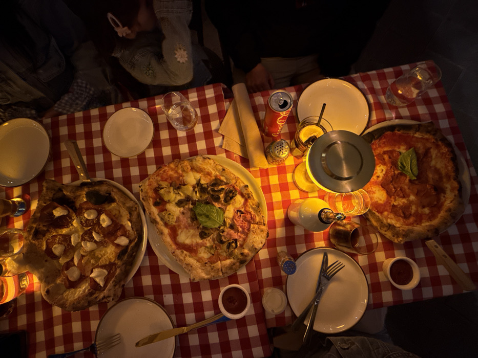 The scene is an overhead view of a restaurant table located in Naples, United States of America