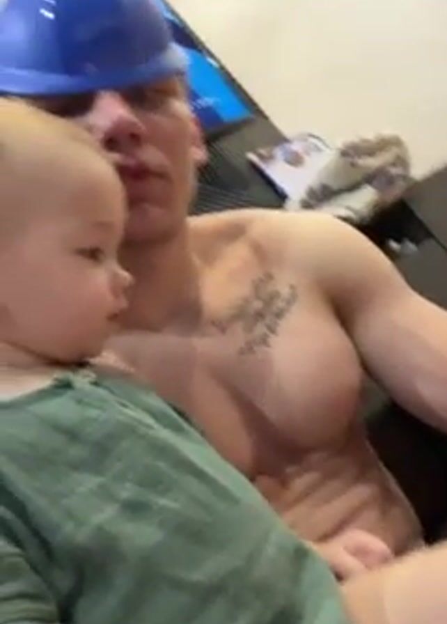 A shirtless man with a blue plastic helmet sits holding a toddler in a green shirt. The man has a tattoo on his upper chest. The toddler looks at the camera and the man looks off into the distance, then down at the toddler. The toddler reaches for the camera and the video ends. In the background there is a TV and various household items. The lighting is bright.