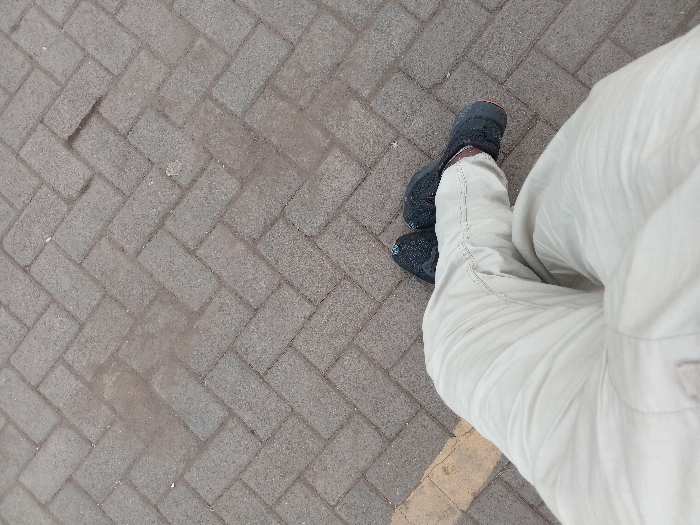 The scene, located in the city of London ward, Kenya, presents a high-angle view focusing on the lower extremities of an individual. The subject is wearing light-colored, possibly beige or khaki, trousers and dark-colored athletic footwear with minor blue accents on the upper material. Their legs are positioned over a ground surface composed of grey rectangular pavers arranged in a herringbone pattern. A faded yellow painted line runs along the left side of the visible pavement. Minor surface discolorations are present on the pavers.