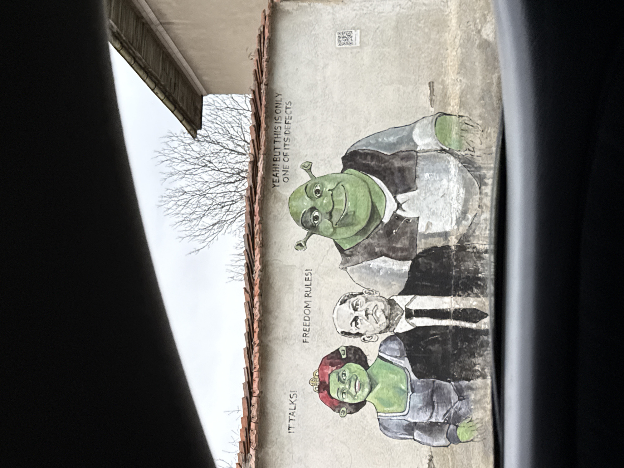 A mural in Novo Zhelezare, Bulgaria, features Shrek, a person in a suit, and Princess Fiona, all seemingly stylized and painted on the side of a building. A quote above Shrek reads "YEAH! BUT THIS IS ONLY ONE OF ITS DEFECTS". Below Shrek is a man in a suit, and below him is Princess Fiona with the quote "IT TALKS!". Between them is written "FREEDOM RULES!". The mural is viewed from inside a vehicle, with parts of the car frame visible on either side of the image. Bare tree branches are visible to the left of the mural, extending from behind the building. A QR code is adhered to the wall above Shrek.