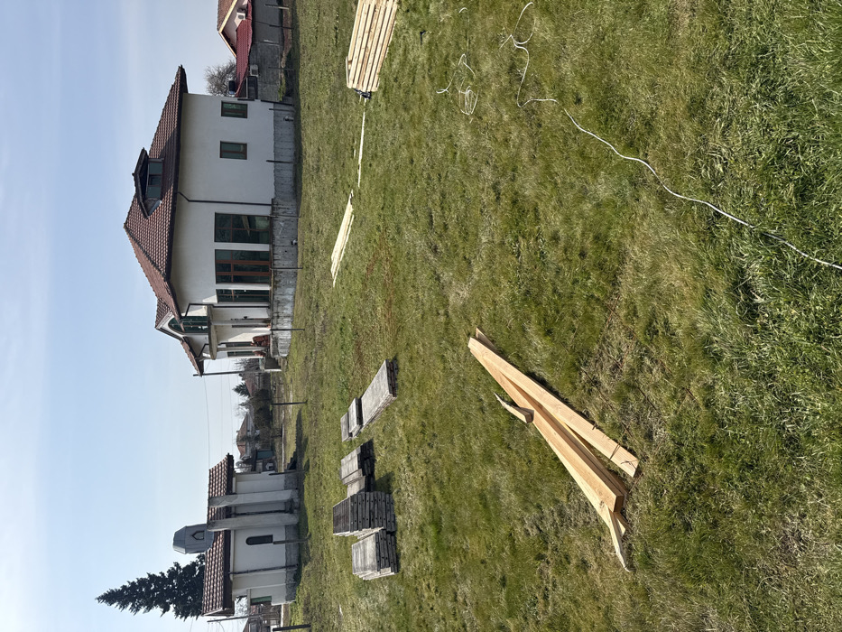 The image displays an outdoor scene in Войводино, Bulgaria, under a clear blue sky. The foreground and midground are dominated by a grassy field. On the grass, multiple stacks of grey, rectangular concrete slabs or pavers are present in the midground-left. Scattered horizontally across the midground are several light-colored wooden planks, with a more substantial pile of rough lumber located in the foreground-left. A white electrical cable or rope is coiled and extended across the grass in the foreground-right. In the background, two distinct structures are visible. To the left, a small, white, single-story building with a red-tiled roof and a grey, domed cupola on its apex stands adjacent to a tall coniferous tree. To the right, a larger, two-story, white residential-style building with a red-tiled hip roof is present. This building features multiple large windows, some with a green tint, and a curved architectural element on its left facade. It appears to be elevated on a concrete foundation, with basic fence posts delineating a perimeter around it. No individuals are visible, and no active construction is in progress. Additional residential buildings with red roofs are partially visible in the distant background.