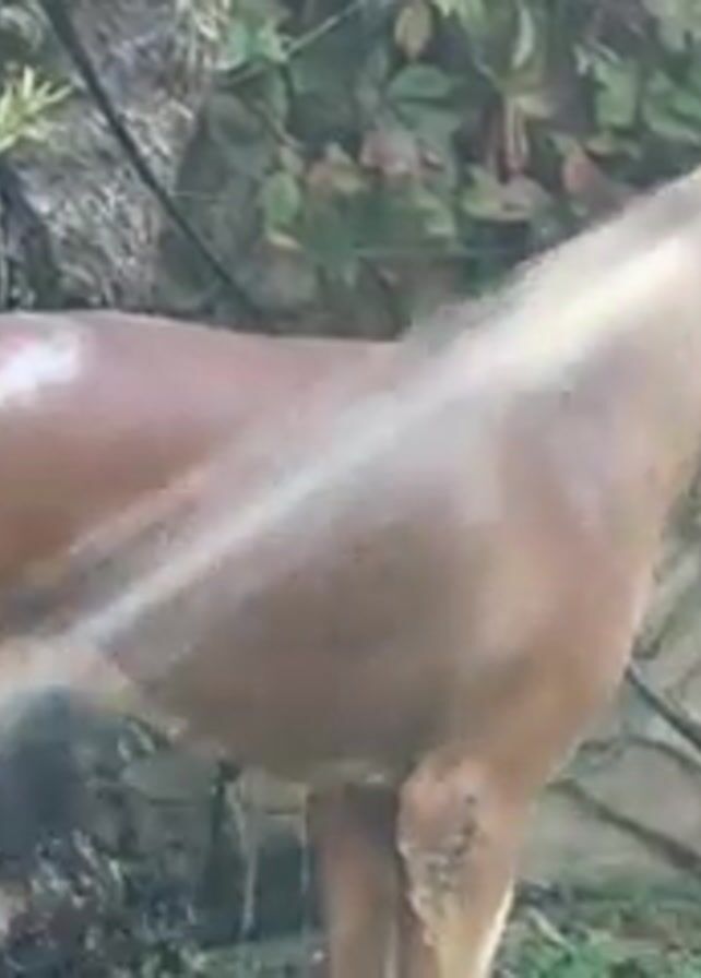 A brown dog stands in a grassy area being sprayed with water from a hose held by an unseen person