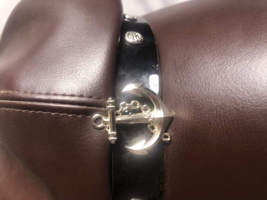 The scene is a close-up, static shot focused on the front portion of a brown, leather-like cap or hat. A vertical seam is visible on the brown material. A horizontal, glossy black band runs across the cap. Centered on this black band is a prominent silver-colored anchor emblem, featuring a small chain detail. To the right of the anchor, on the black band, at least two distinct circular, silver-colored emblems with textured, possibly skull-like, relief designs are spaced evenly. The background is out of focus, appearing as a light, textured surface. There are no people, explicit actions, or environmental details within the image to indicate a specific location in Rido, Nigeria, or any other city.