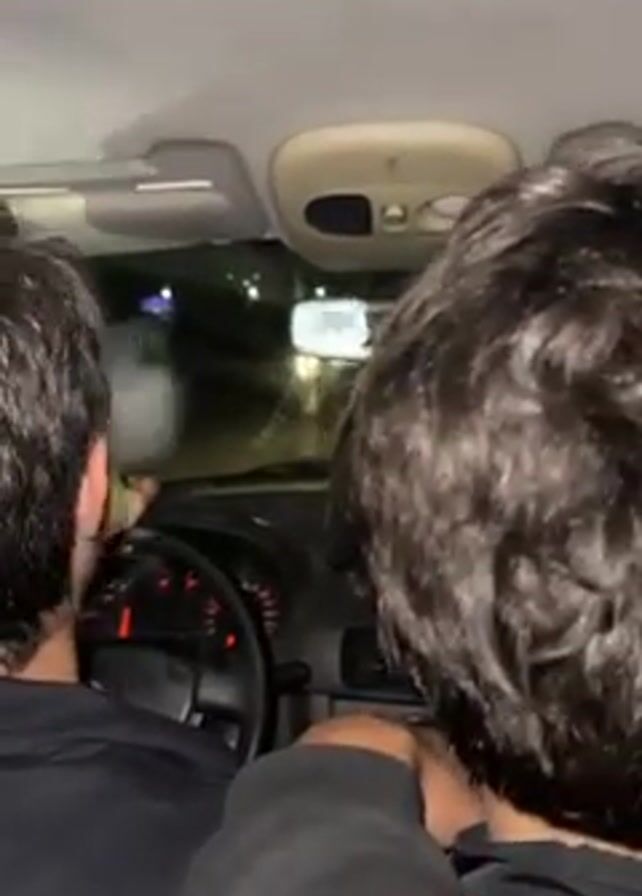Two young men are in the front seats of a car at night. The driver is wearing a black sweatshirt and has dark curly hair. The passenger is also wearing a black sweatshirt and has dark hair. They are driving on a road with streetlights and other cars visible in the distance. Music is playing. The dashboard of the car is visible, with red lights illuminated. The overall atmosphere appears casual and relaxed.