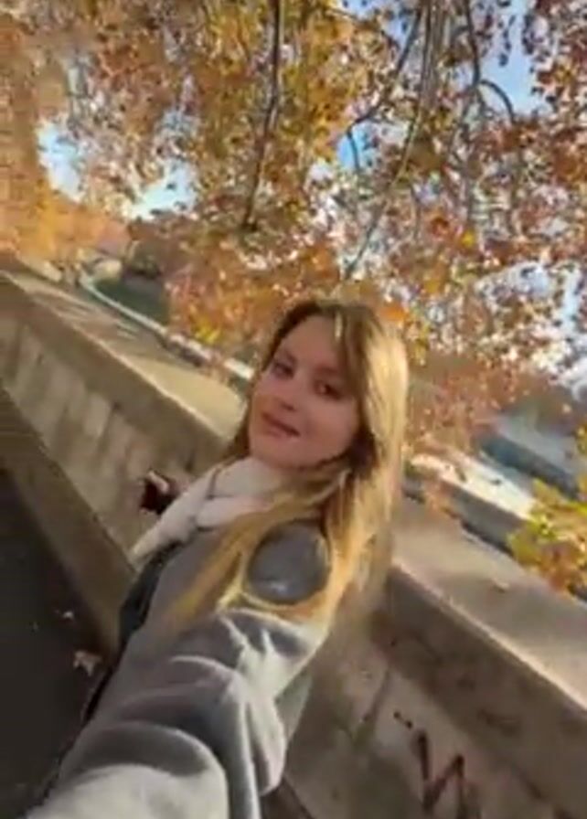 A young woman with long blonde hair and bangs, wearing a gray coat and a white scarf, is walking along a stone wall under trees with orange leaves. The sun is shining through the leaves. The video is shot from a low angle and moves as the woman walks. A river is visible in the background.