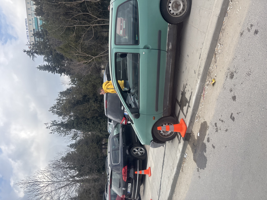 The image displays an urban street scene in Varna, Bulgaria, specifically near the University Hospital "St. Marina," whose name "СВЕТА МАРИНА" is visible on a building in the background. In the foreground, a mint green, two-door Renault Twingo hatchback is parked, with its driver's side front wheel partially mounted on the concrete sidewalk. An orange traffic cone with reflective stripes is placed directly in front of this wheel. Adjacent to the Twingo, a dark-colored SUV, possibly a Ford Kuga, is parked. A male subject, wearing a yellow hooded sweatshirt with "MICHAEL" printed on the chest, stands between the green Twingo and the SUV, facing left. Further to the left, a black Volkswagen Passat B8 wagon, bearing Bulgarian license plate "CC 0286 CP," is parked with its driver's side rear wheel on the sidewalk, behind which another identical orange traffic cone is placed. Several other vehicles are partially visible in the mid-ground and background. The ground consists of an asphalt road in the foreground and a concrete sidewalk. Both surfaces show dark stains, possibly from liquids, and are scattered with debris including cigarette butts and a yellow wrapper. Bare deciduous trees and dense evergreen conifers are visible behind the parked vehicles, partially obscuring the multi-story hospital building. The sky is overcast, indicating a cloudy day.