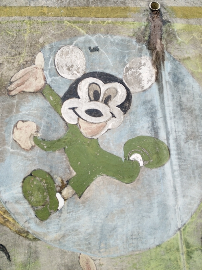 Location: Voa Yeav, Cambodia. The image depicts a significantly weathered mural of the cartoon character Mickey Mouse, painted on a cracked concrete or asphalt surface. The character features a black head with white face and large ears, a smiling expression, light tan hands, and white shoes, all encased in a faded olive green tunic and trousers. Mickey Mouse is positioned in a dynamic, mid-stride or jumping pose with bent limbs. This artwork is contained within a faded light blue circular field, which is severely cracked. The surrounding pavement is mottled grey and green, showing extensive surface deterioration. In the upper right corner, a circular metallic pipe outlet is visible, from which a dark, vertical runoff stain descends onto the painted surface. Faint horizontal bands of yellow and green appear in the upper background, indicating further pavement details.