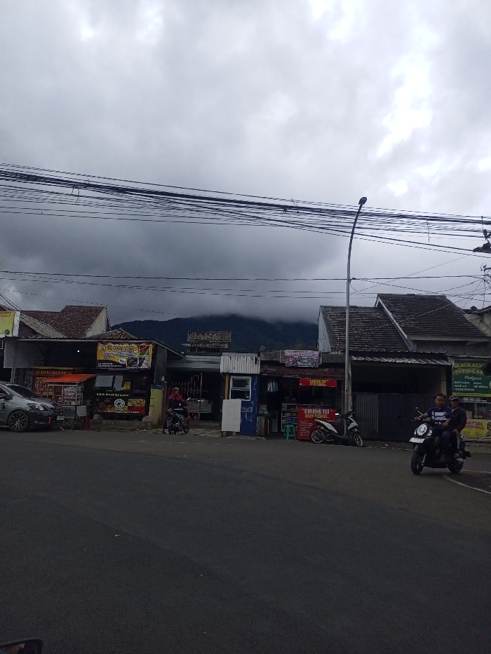 A street scene shows several storefronts with a mountain shrouded in cloud cover in the background. Power lines stretch across the sky. Two individuals on a motorbike are in the foreground and a lone motorcyclist appears to be traveling away from the viewer. There are other motorbikes parked near the stores. The sky is overcast.